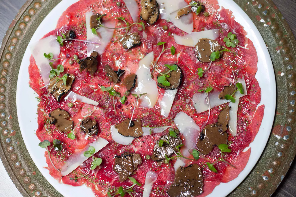 Carpaccio Di Manzo Finas laminas de filete de res fresco, hongos, cebolla morada, alcaparras, limón, perejil, arúgula, parmigiano Grana Padano y aceite de oliva. | $ 357 | |