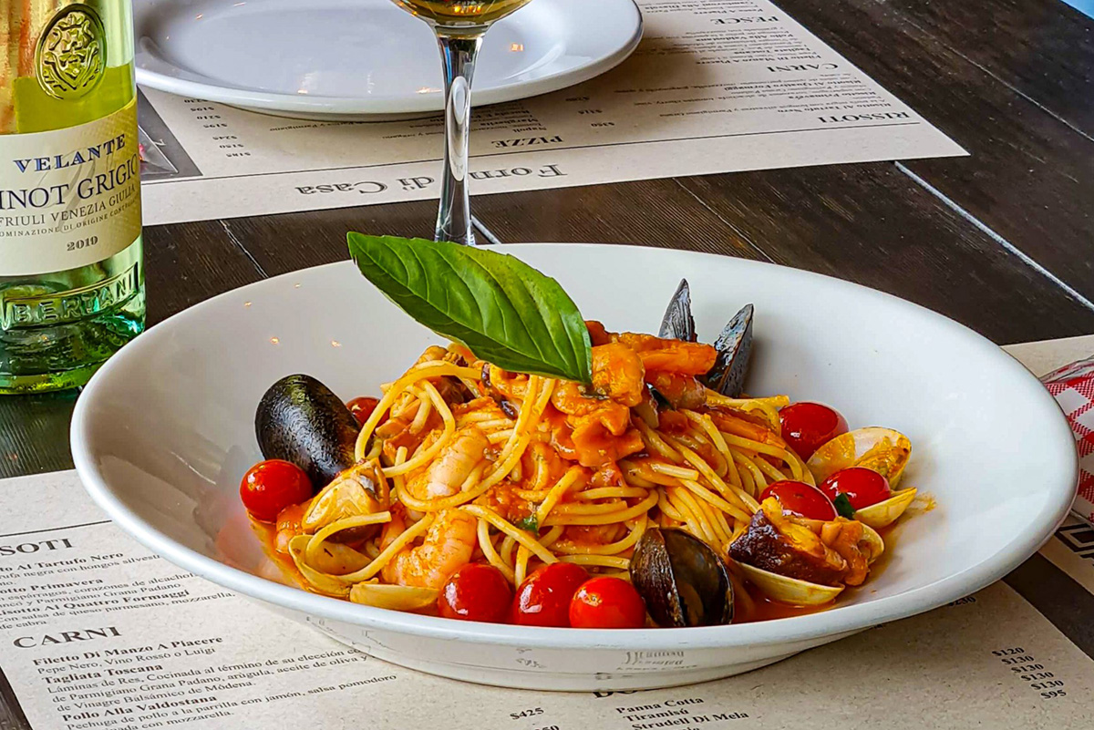 Spaghetti Al Frutti Di Mare Con almejas, mejillones, camarones, pulpo, salmón y aros de calamar, cocinados al vino blanco, con pomodoro y perejil. | $ 438 | |